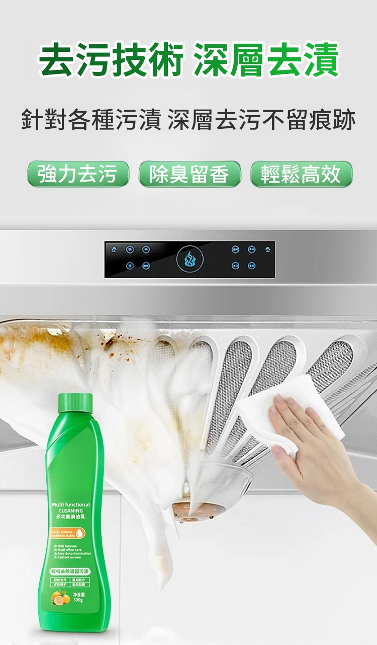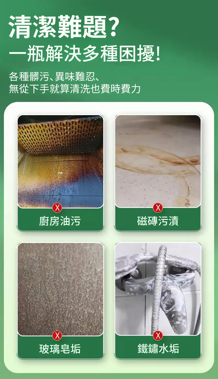 它的清潔力堪稱 「家事救星」!含有效抗油污成分,蓬鬆泡沫能快速滲透頑固污漬,不管是燃氣爐上的焦黑油漬、油煙機的重油污,還是浴室瓷磚的水垢、家具上的茶漬咖啡漬,甚至是煙草焦油、家電表面污垢,一噴一擦就能乾淨,去污率超 94%!對比普通液體清潔劑,它溶解油污能力強 5 倍,玻璃板上的油脂浸泡 10 分鐘就能徹底清除